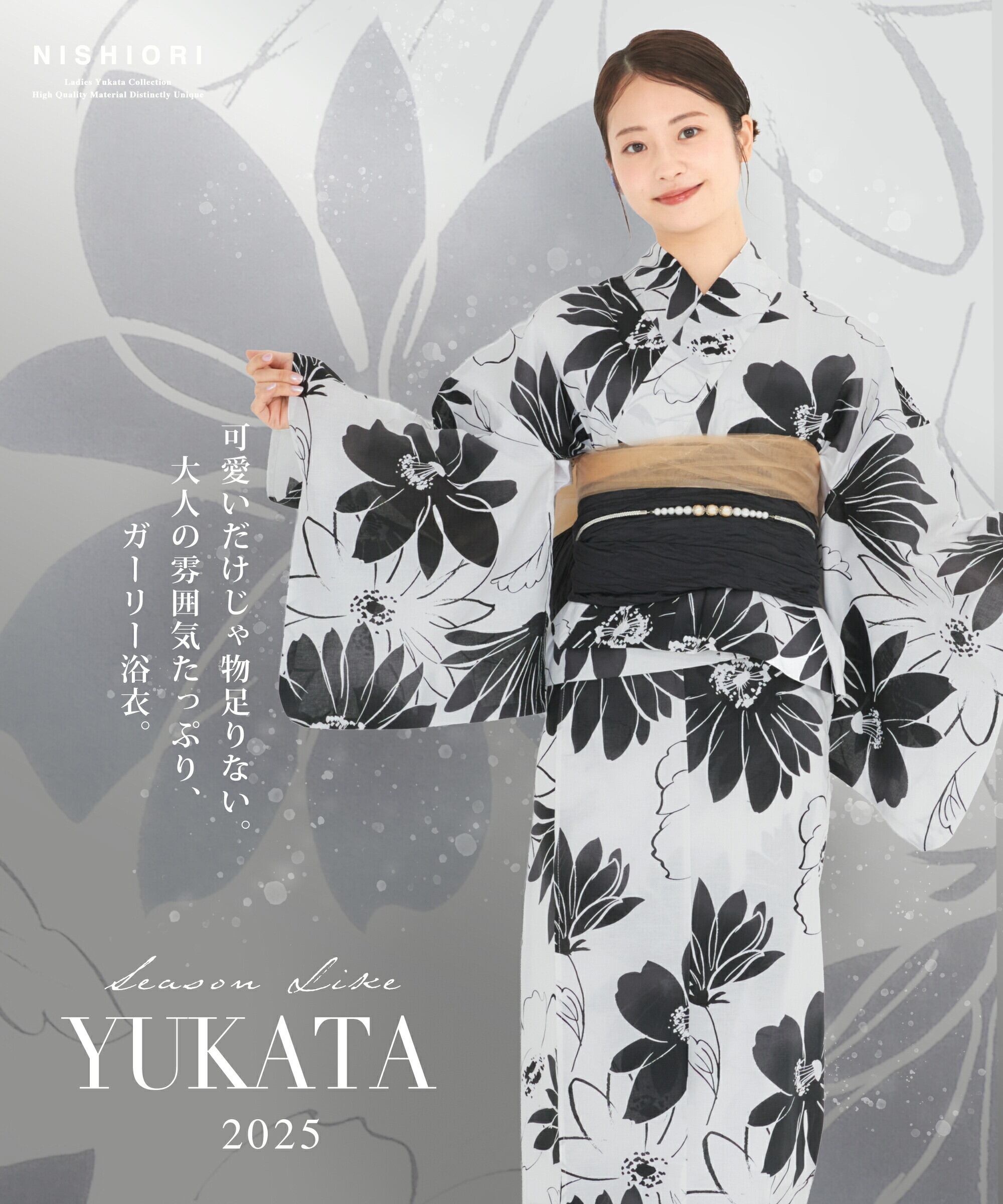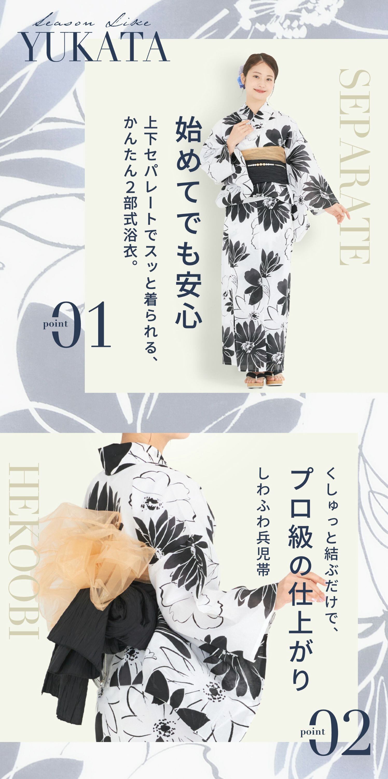 着付けが簡単な《二部式タイプ》のセパレート浴衣に、柔らかい質感のしわ兵児帯を合わせた2点セットです。