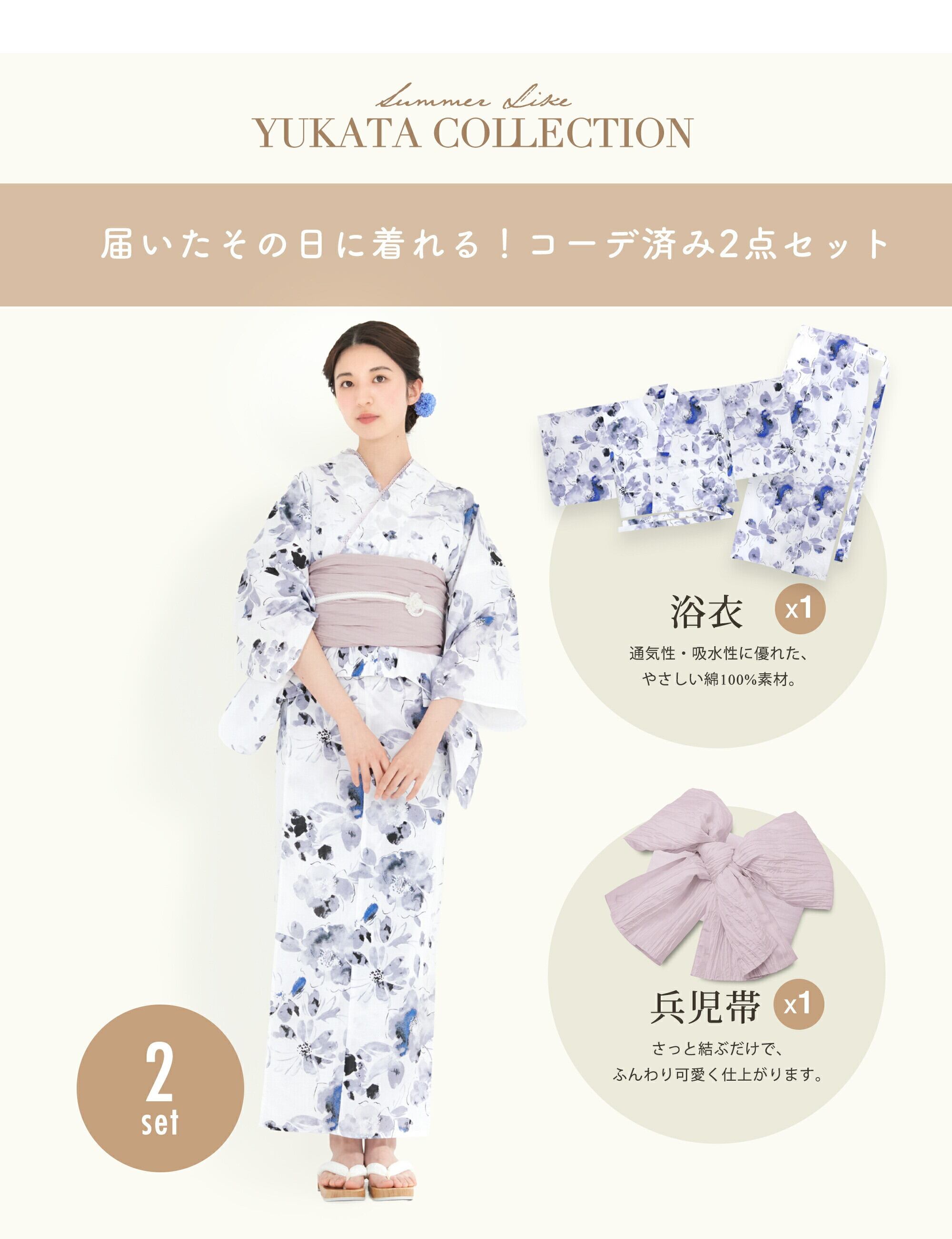 着付けが簡単な《二部式タイプ》のセパレート浴衣に、柔らかい質感のしわ兵児帯を合わせた2点セットです。