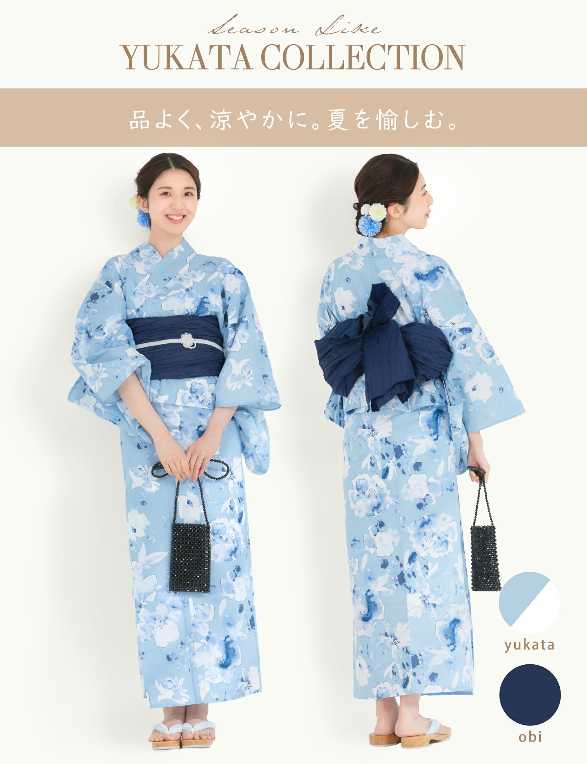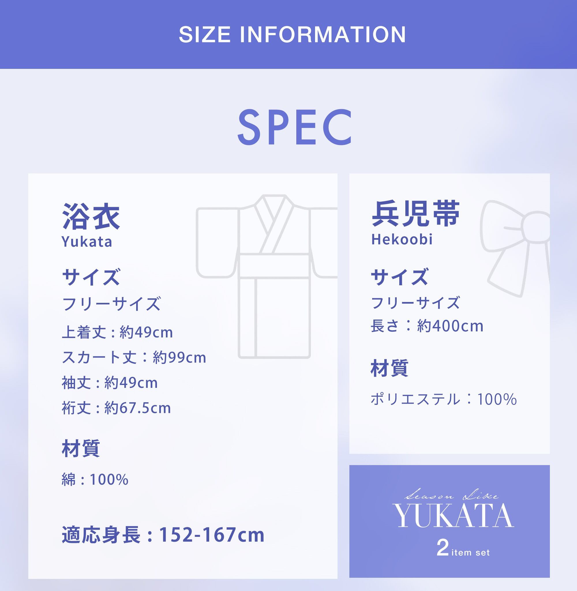 着付けが簡単な《二部式タイプ》のセパレート浴衣に、柔らかい質感のしわ兵児帯を合わせた2点セットです。