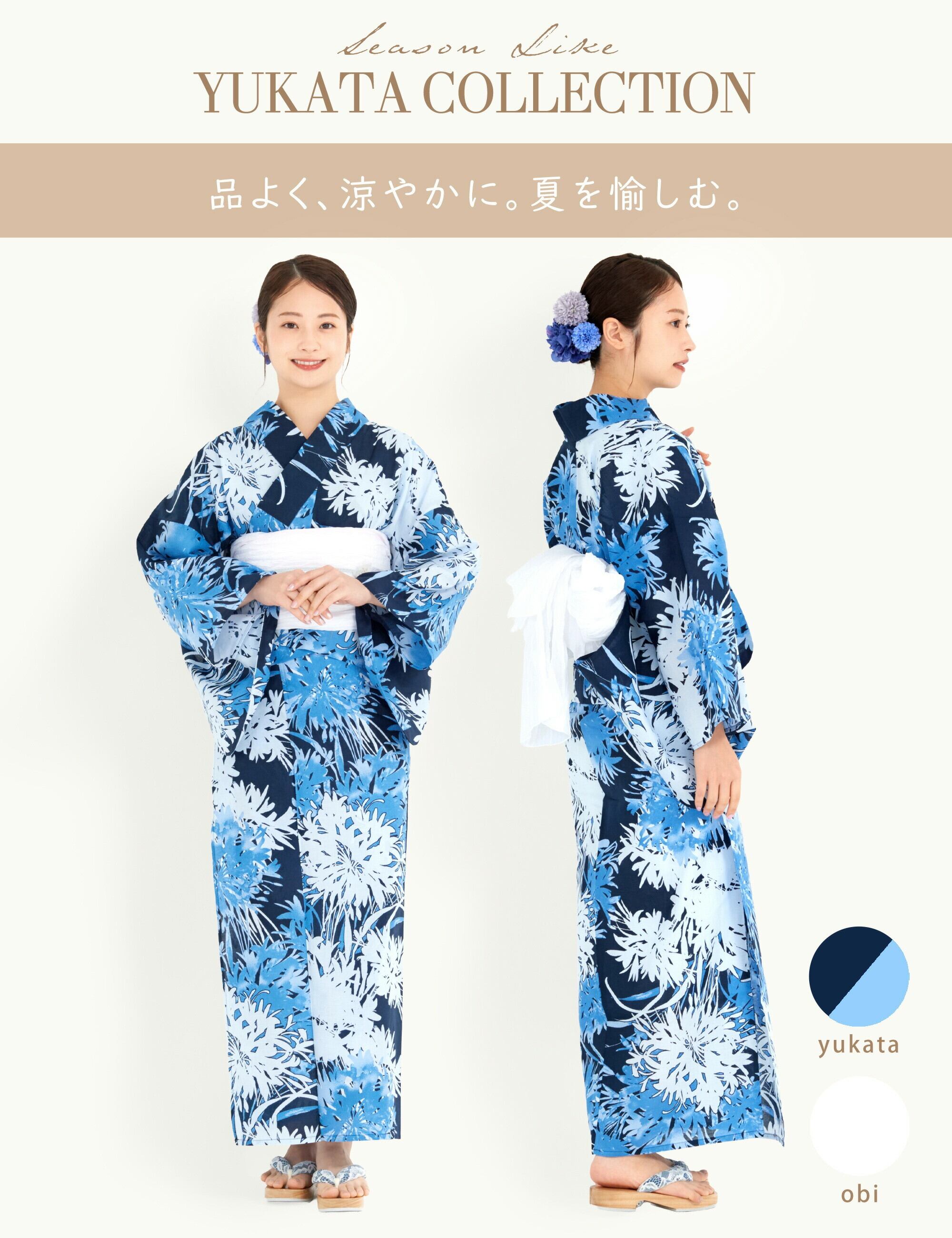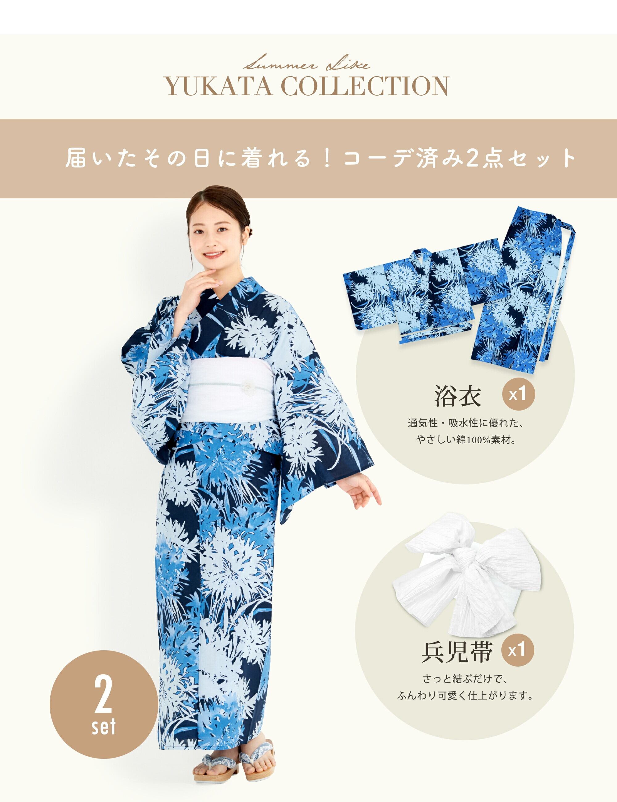 着付けが簡単な《二部式タイプ》のセパレート浴衣に、柔らかい質感のしわ兵児帯を合わせた2点セットです。