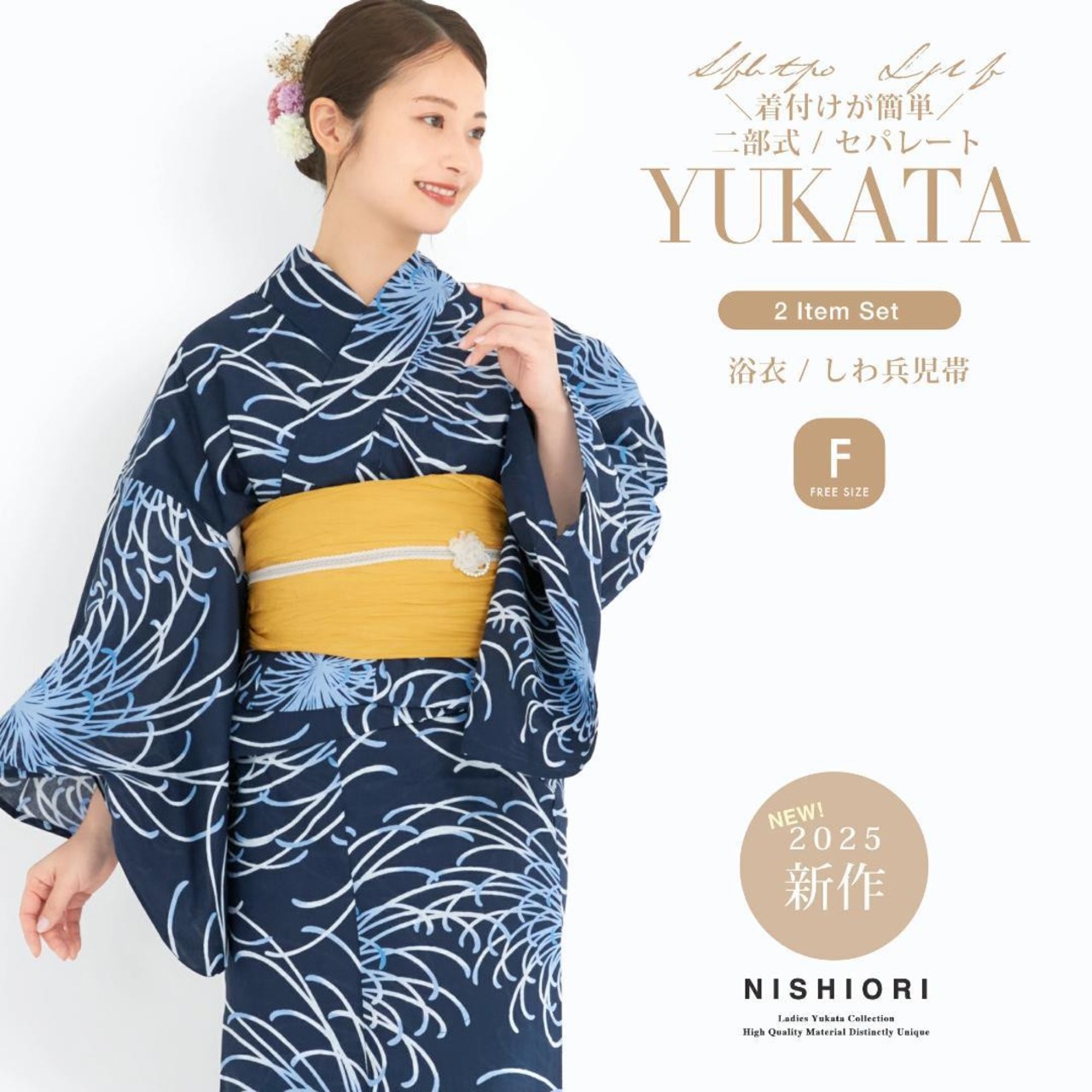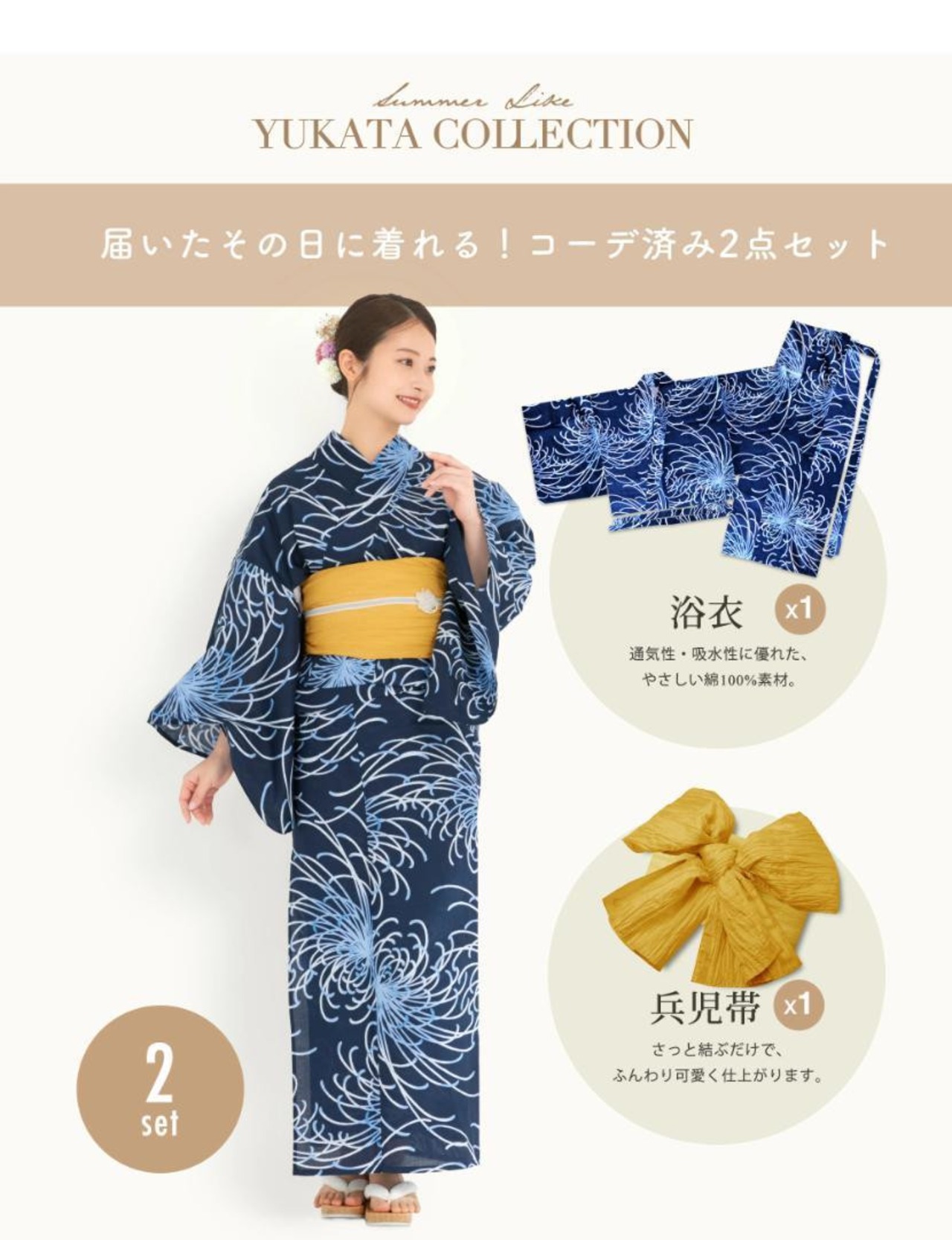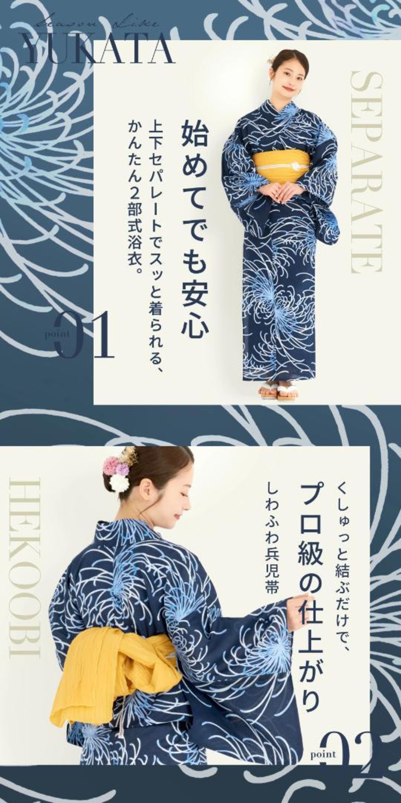 着付けが簡単な《二部式タイプ》のセパレート浴衣に、柔らかい質感のしわ兵児帯を合わせた2点セットです。
