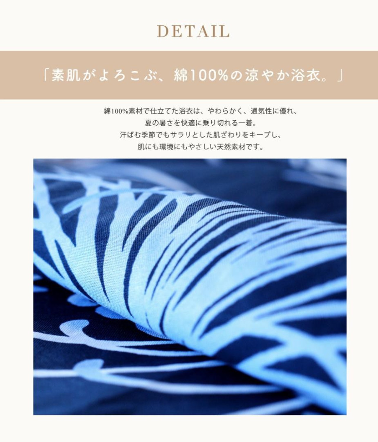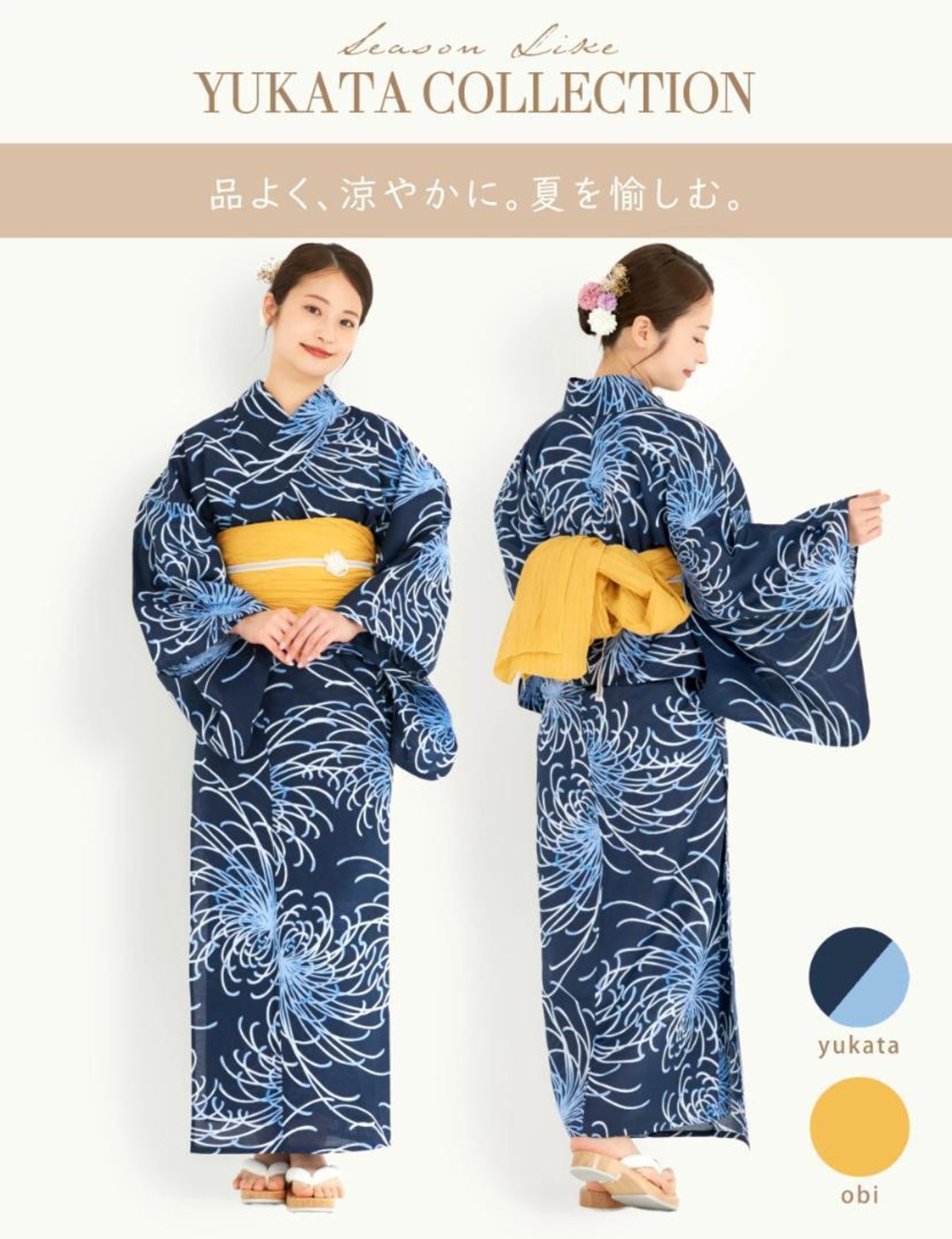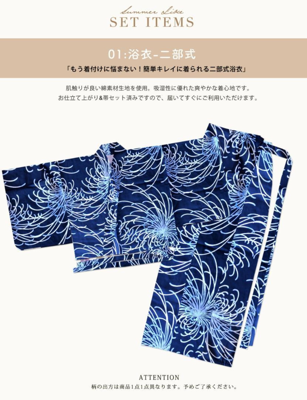 着付けが簡単な《二部式タイプ》のセパレート浴衣に、柔らかい質感のしわ兵児帯を合わせた2点セットです。
