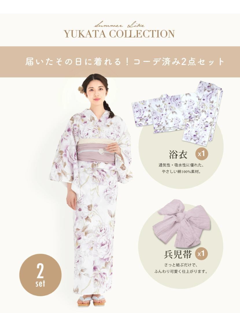 着付けが簡単な《二部式タイプ》のセパレート浴衣に、柔らかい質感のしわ兵児帯を合わせた2点セットです。