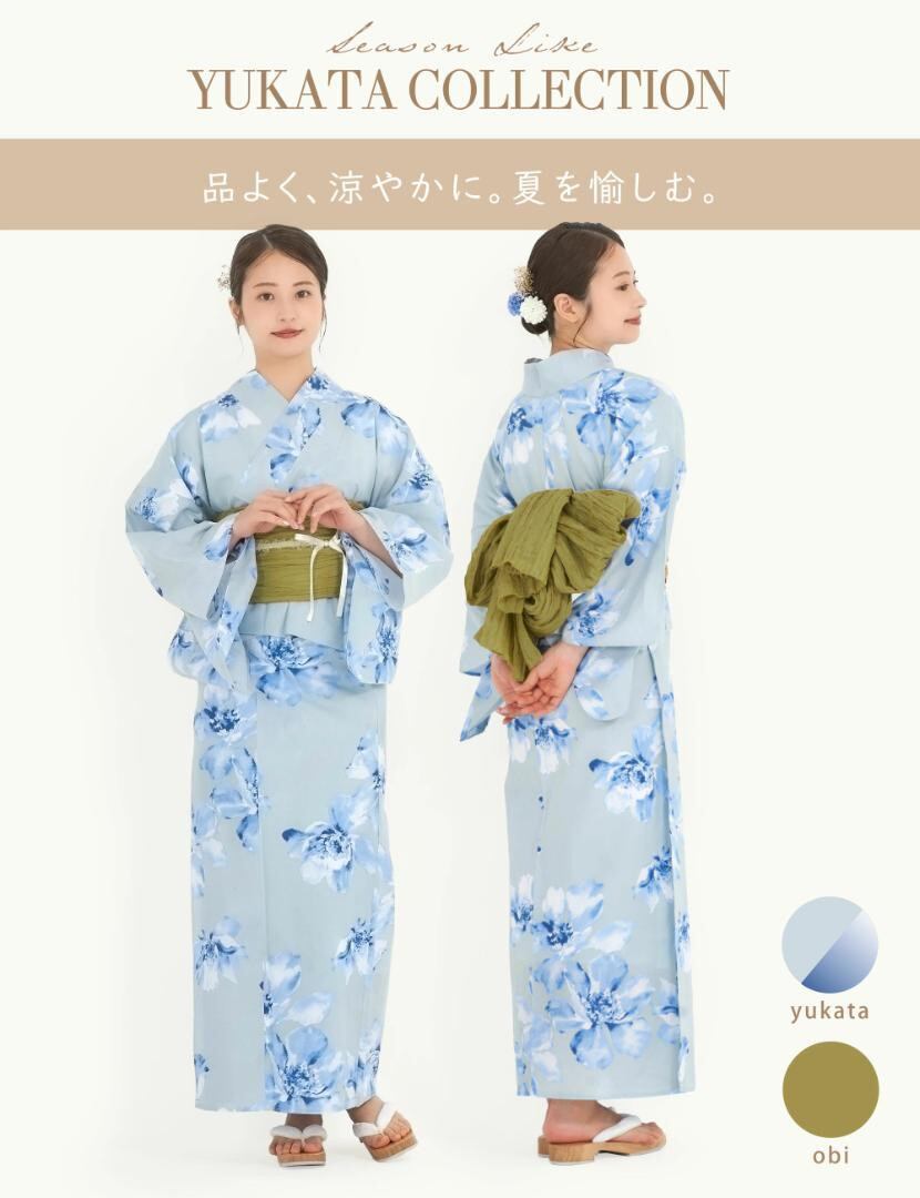 着付けが簡単な《二部式タイプ》のセパレート浴衣に、柔らかい質感のしわ兵児帯を合わせた2点セットです。