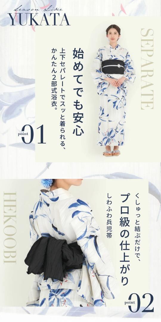 着付けが簡単な《二部式タイプ》のセパレート浴衣に、柔らかい質感のしわ兵児帯を合わせた2点セットです。