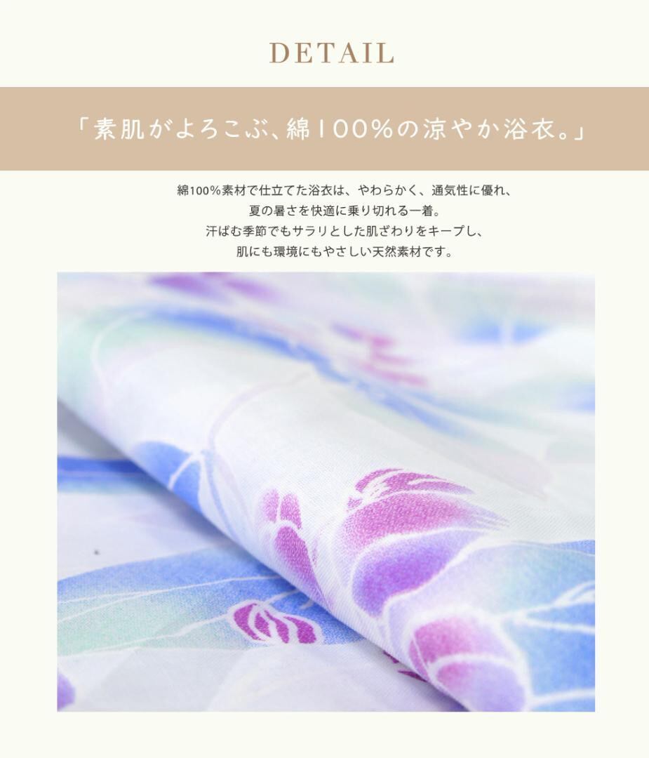 着付けが簡単な《二部式タイプ》のセパレート浴衣に、柔らかい質感のしわ兵児帯を合わせた2点セットです。