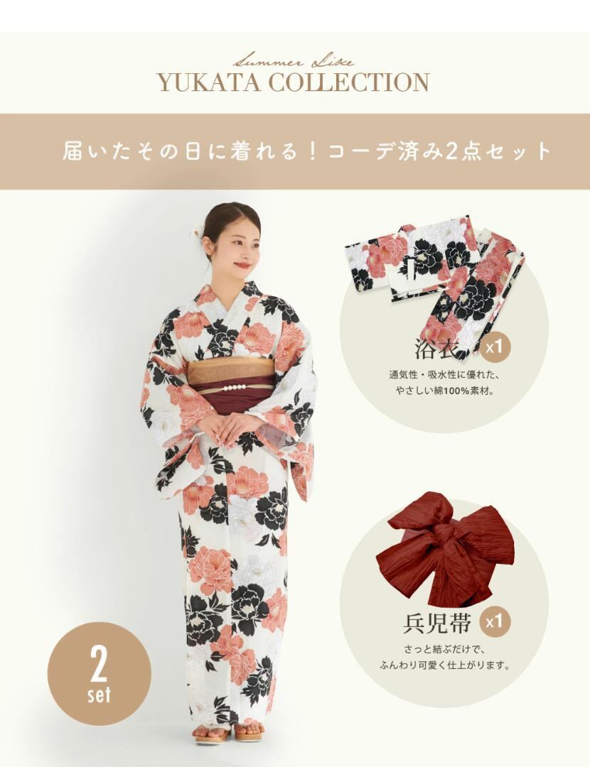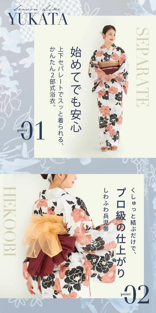 着付けが簡単な《二部式タイプ》のセパレート浴衣に、柔らかい質感のしわ兵児帯を合わせた2点セットです。