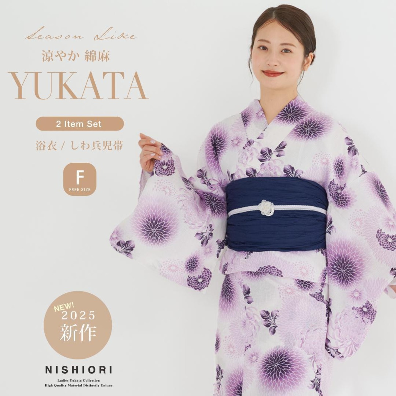 【綿麻】浴衣 帯付き 2点セット 白 紫 フリーサイズ レディース No.3
