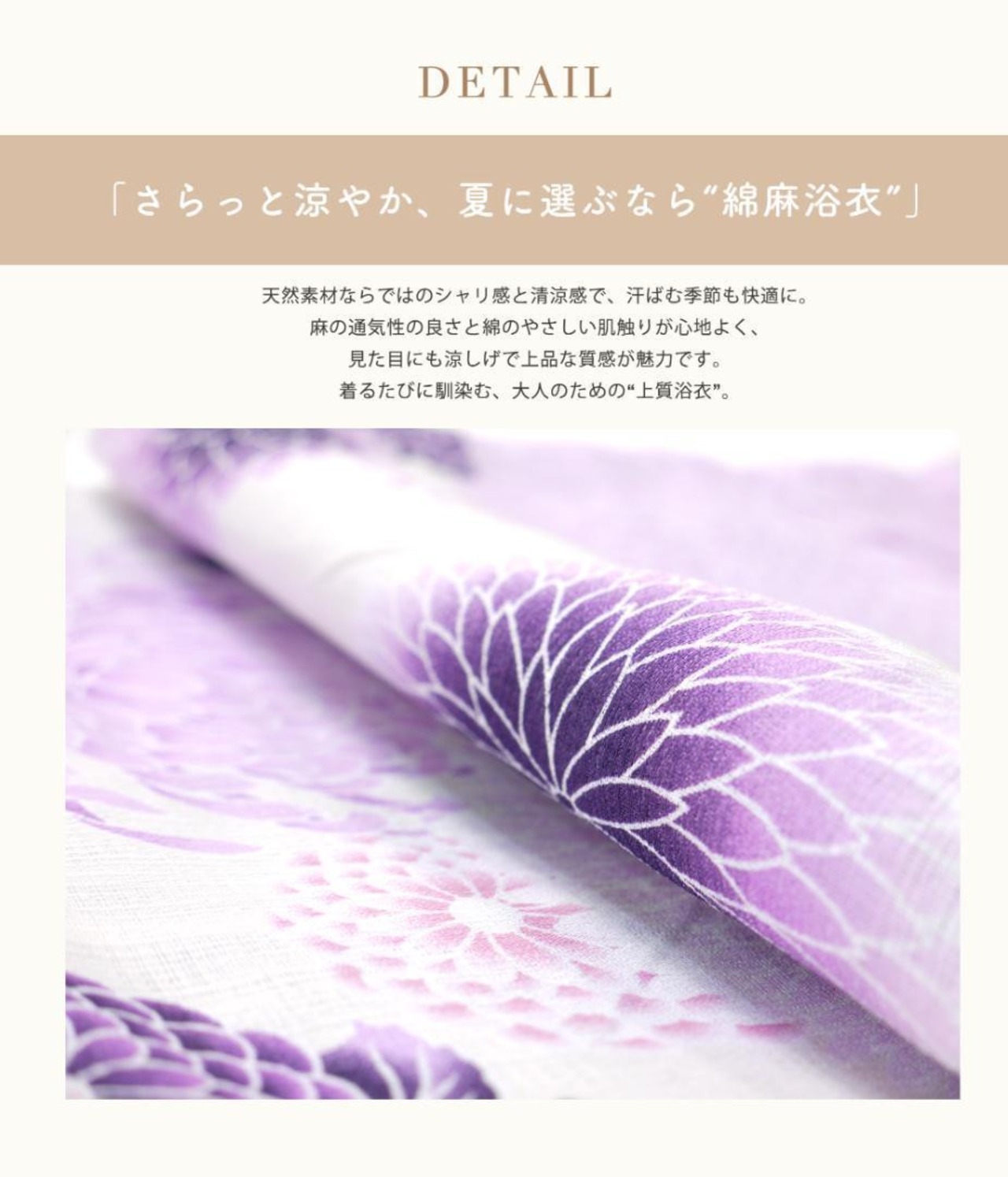 自然な風合いが魅力の綿麻素材を使用した、夏にぴったりの浴衣セットです。