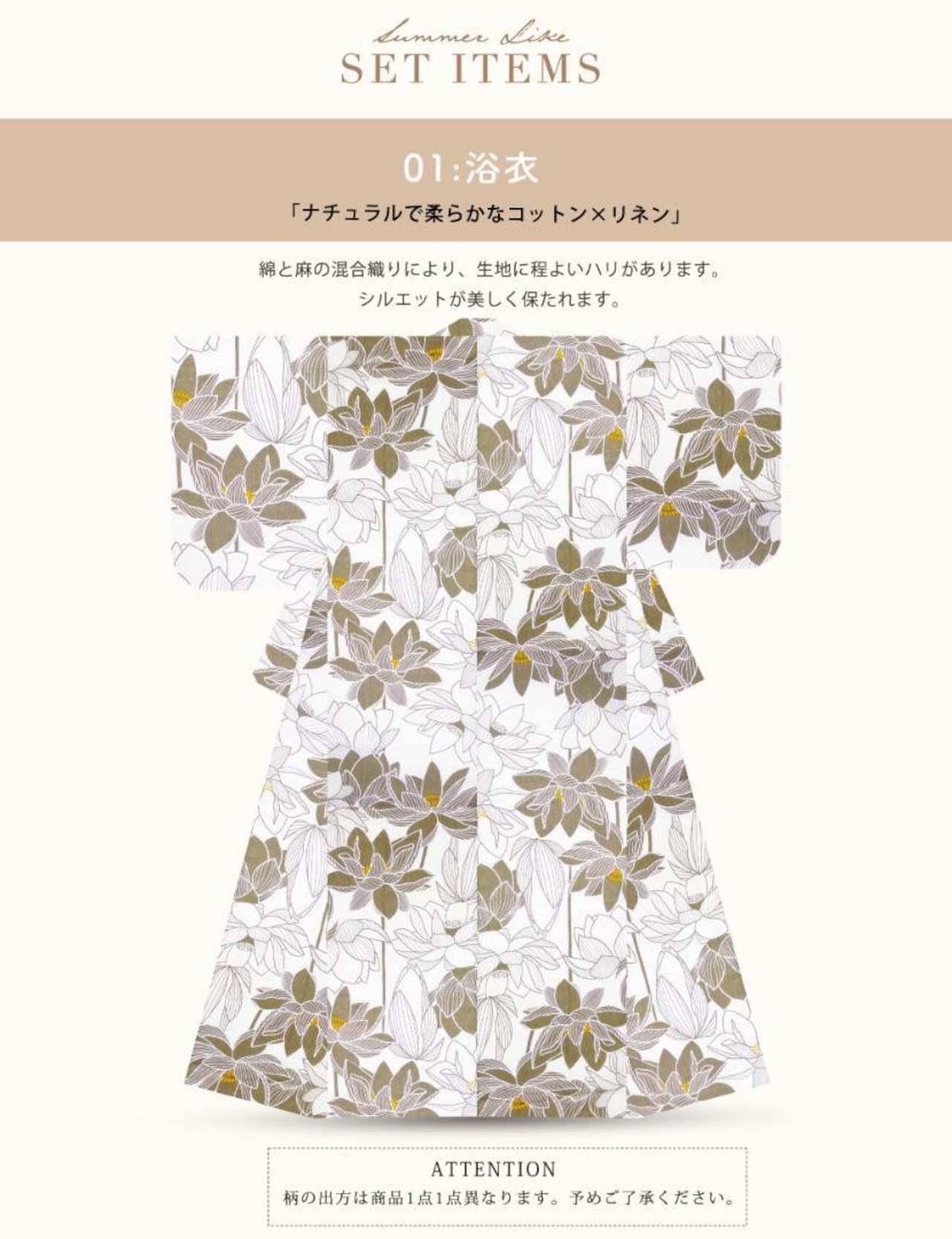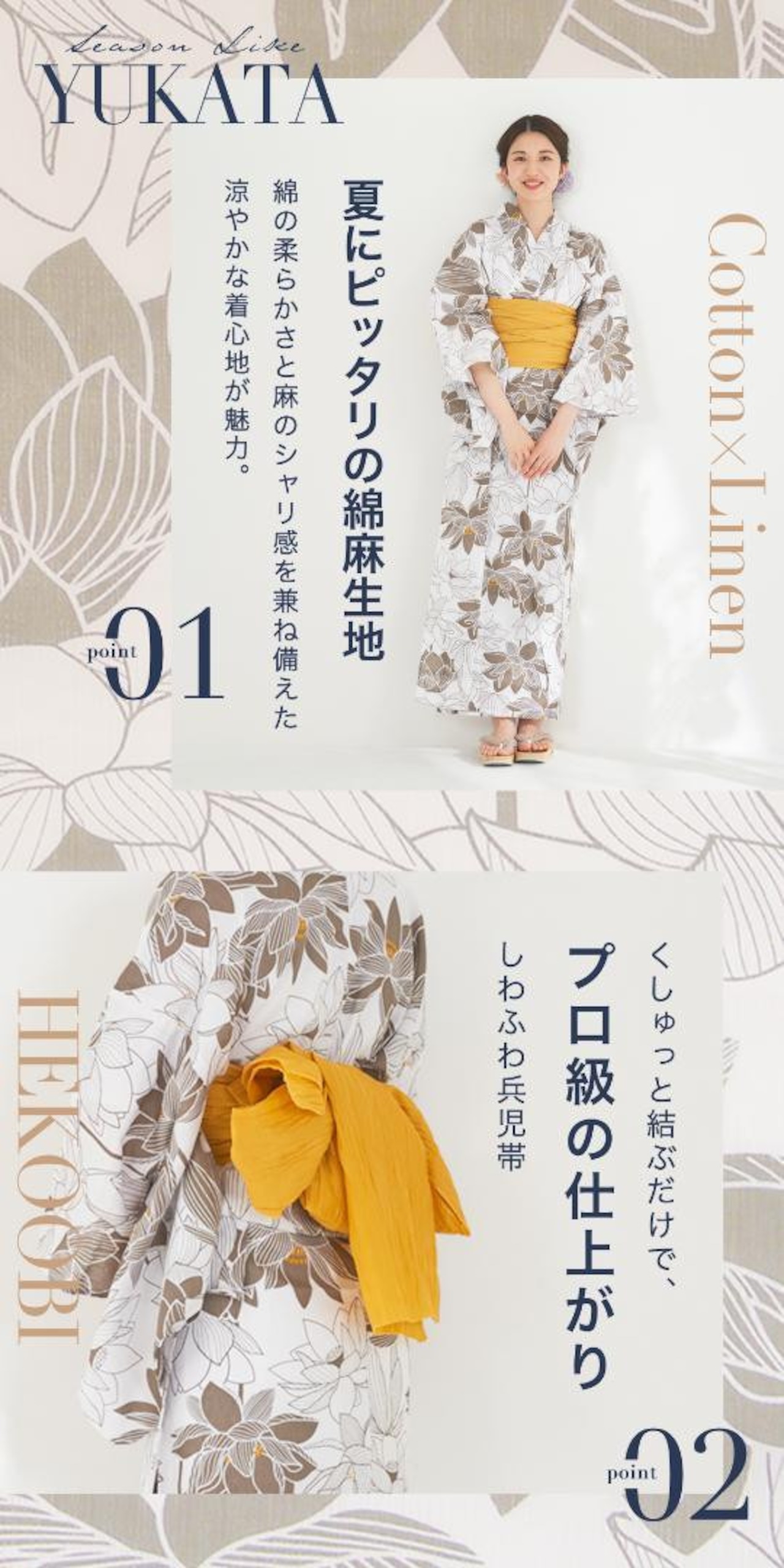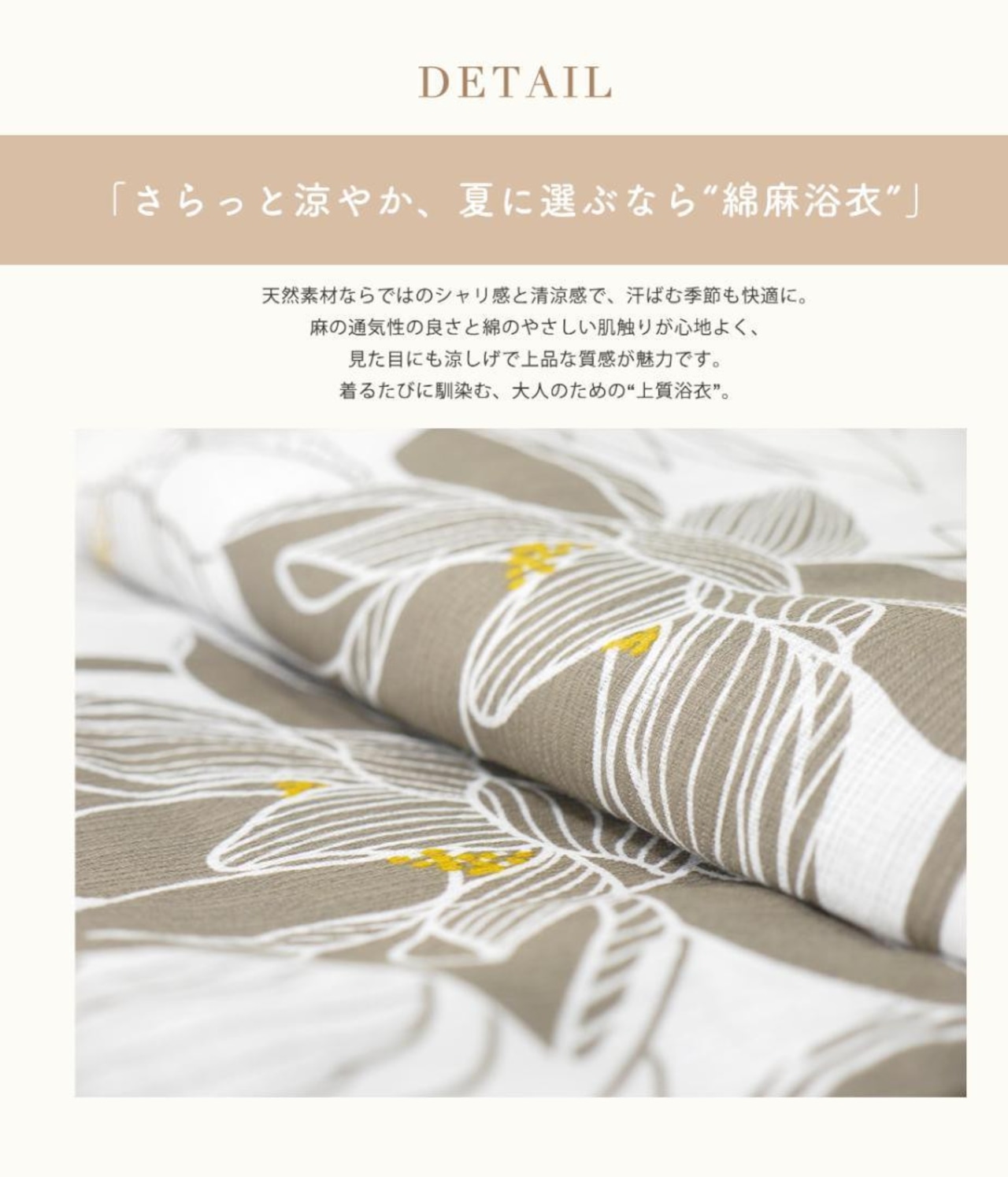 自然な風合いが魅力の綿麻素材を使用した、夏にぴったりの浴衣セットです。