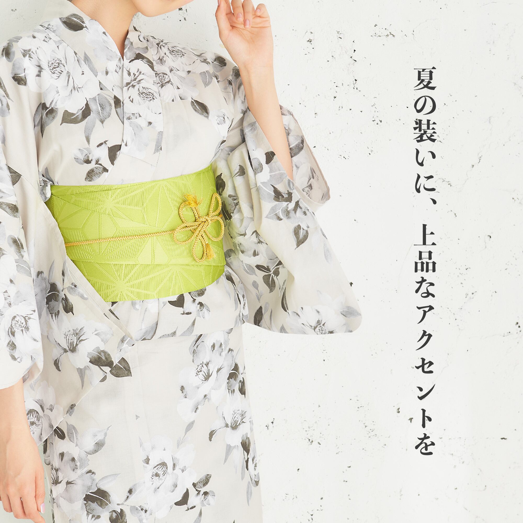 美しい光沢感と立体感のある織りが、シンプルな浴衣コーデを格上げします。