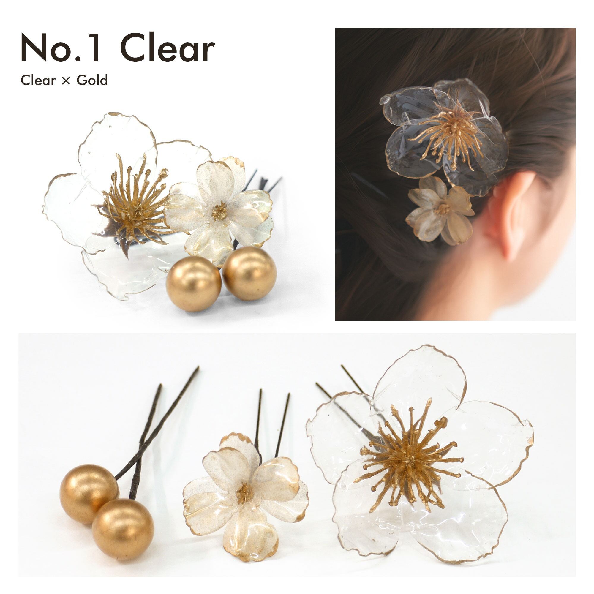 まるでガラス細工のように美しい、透明感あふれるフラワーモチーフの髪飾り4点セット「Clear Bloom」。