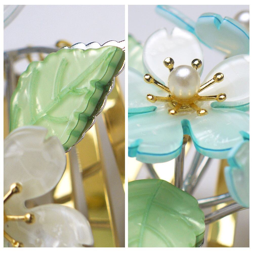 爽やかな白と淡いブルーの花びらに、やわらかなグリーンの葉が添えられた、涼しげで可憐な印象のかんざし(簪)です。