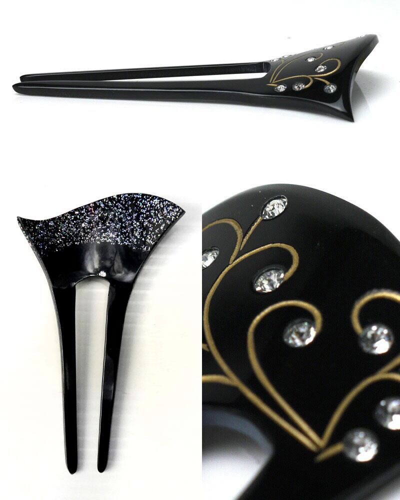 艶やかな黒地に繊細な金彩ライン、そして上品に輝くビジューが施されたモダンな簪(かんざし)です。