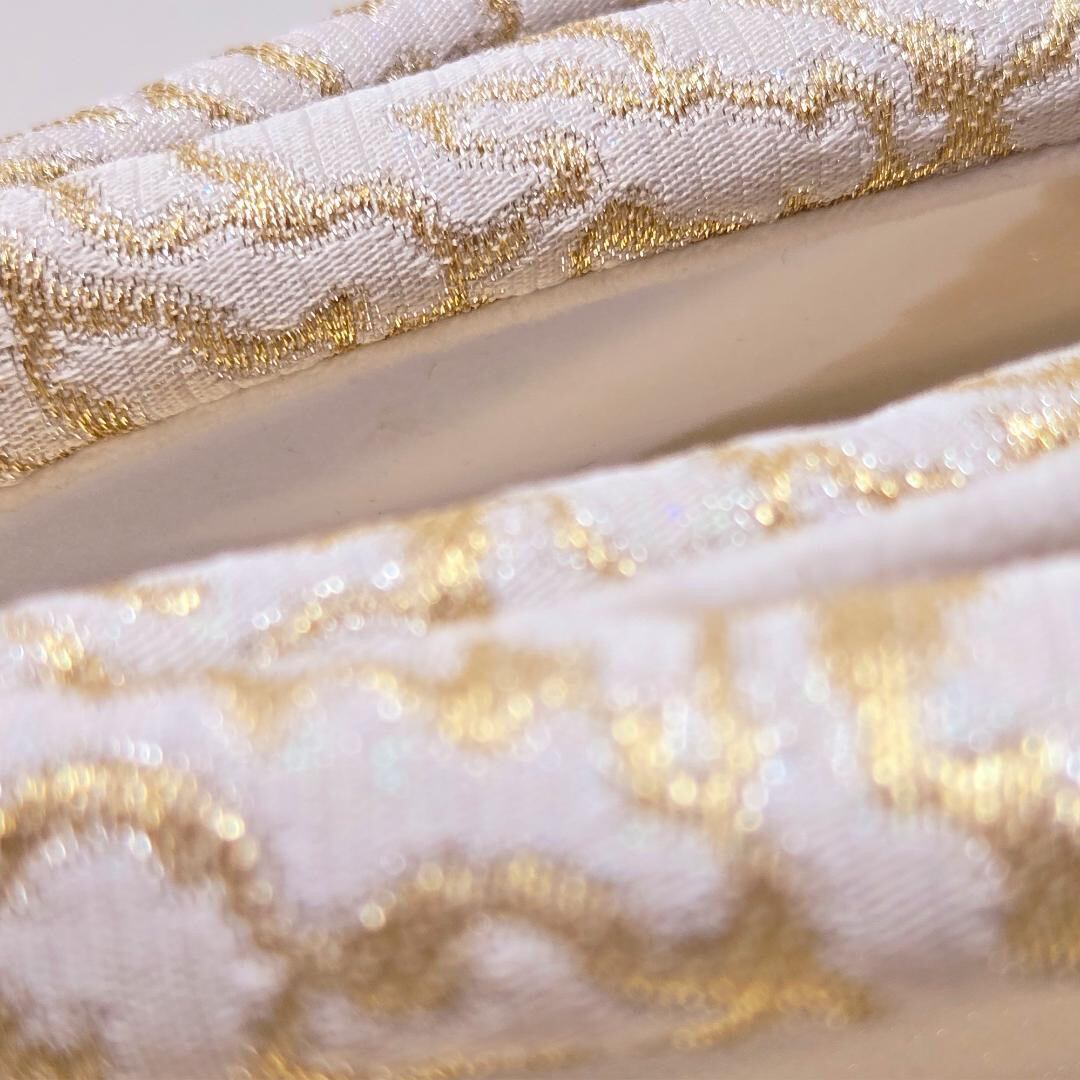 金色の台に、白地に金糸を織り込んだ鼻緒を合わせた高級感のあるデザイン。礼装用として、留袖や訪問着、振袖など幅広いフォーマルシーンにおすすめです。