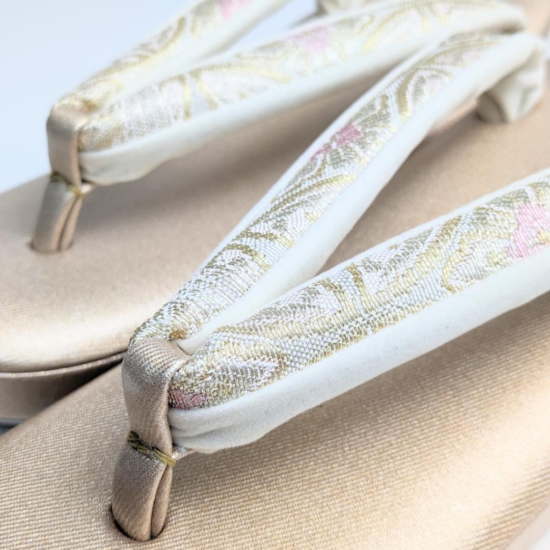 ※帯地を使用する場所の関係で、商品によって若干ですが鼻緒の柄の配置が少し変わる場合があります。