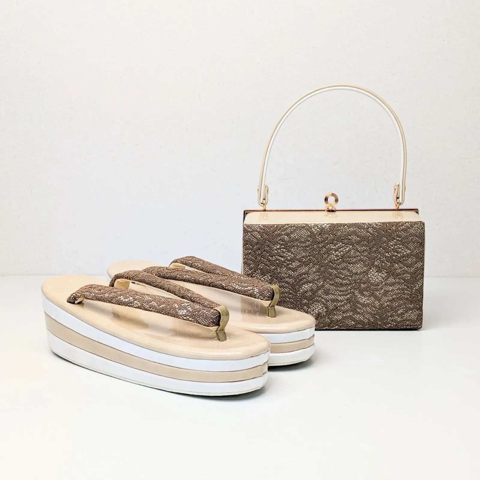 和装 草履 バッグ セット レース×ラメ ブラウン フリーサイズ u73-3