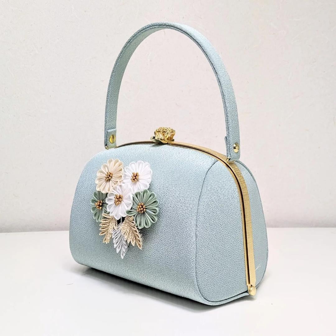 髪飾りのようなつまみ細工を贅沢に使用した、高級感のあるバッグ。