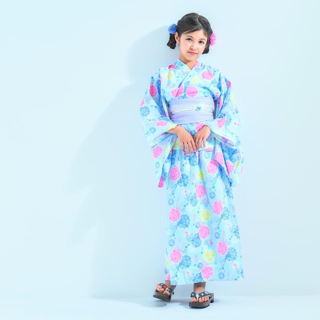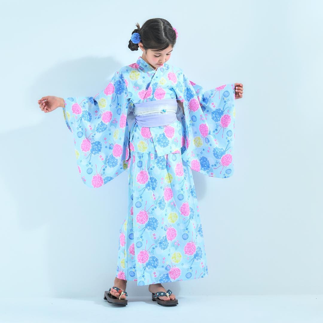 キッズ 子供 2way 浴衣 ワンピース 帯付き 青 紫陽花 風船 100〜150cm 10w-2