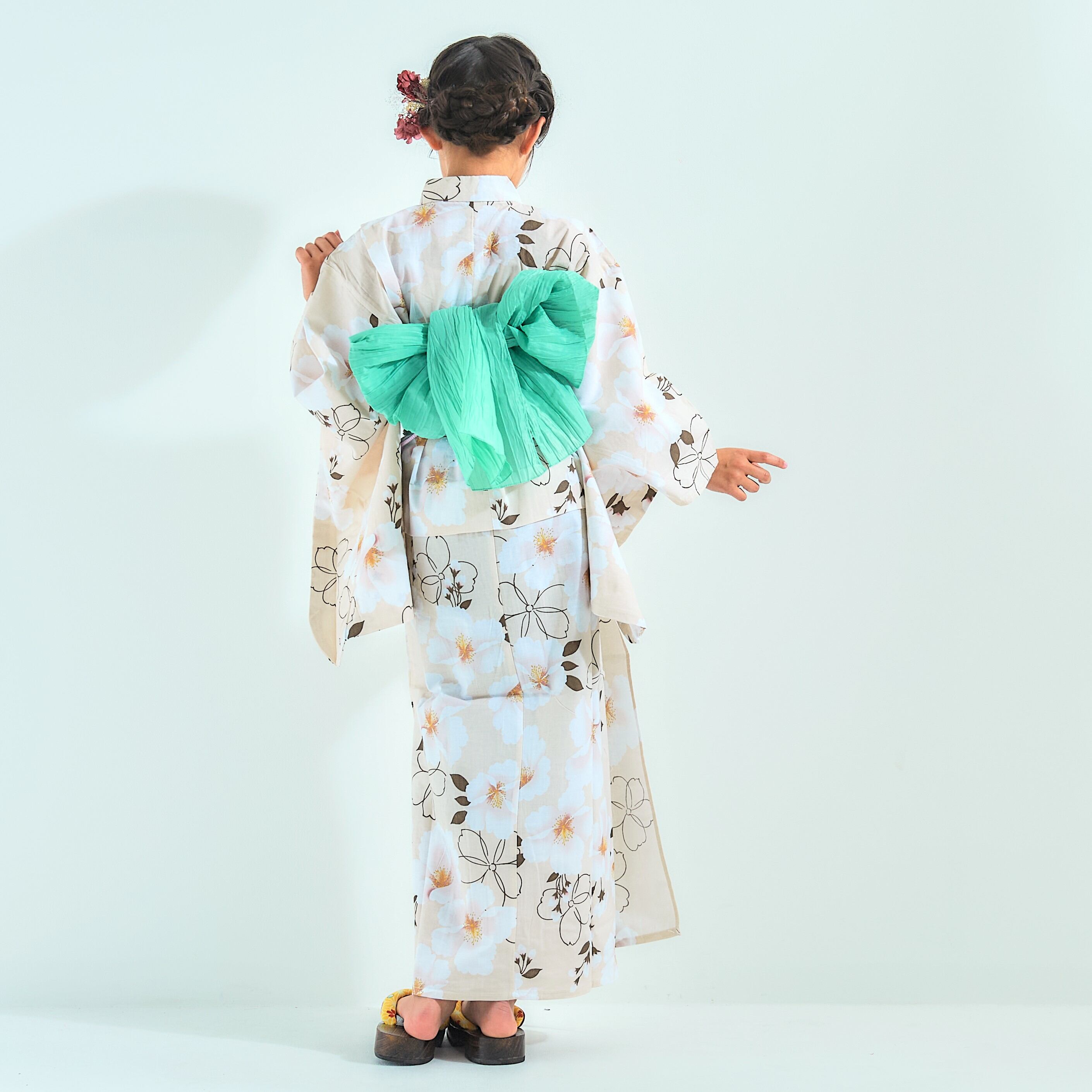 【2点セット】キッズ 子供 浴衣 ゆかた しわへこ 帯とセット クリーム 110〜130cm