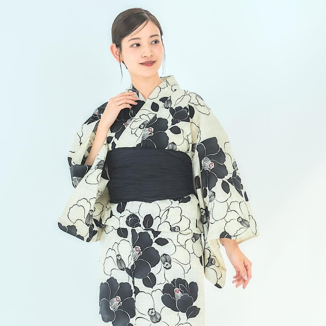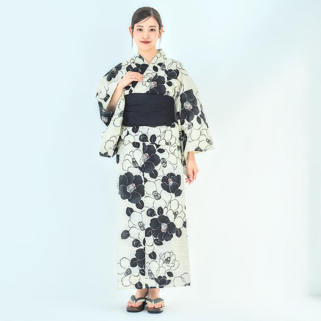 【2点セット】浴衣 兵児帯付き レディース 白 生成り 黒 椿 wy15