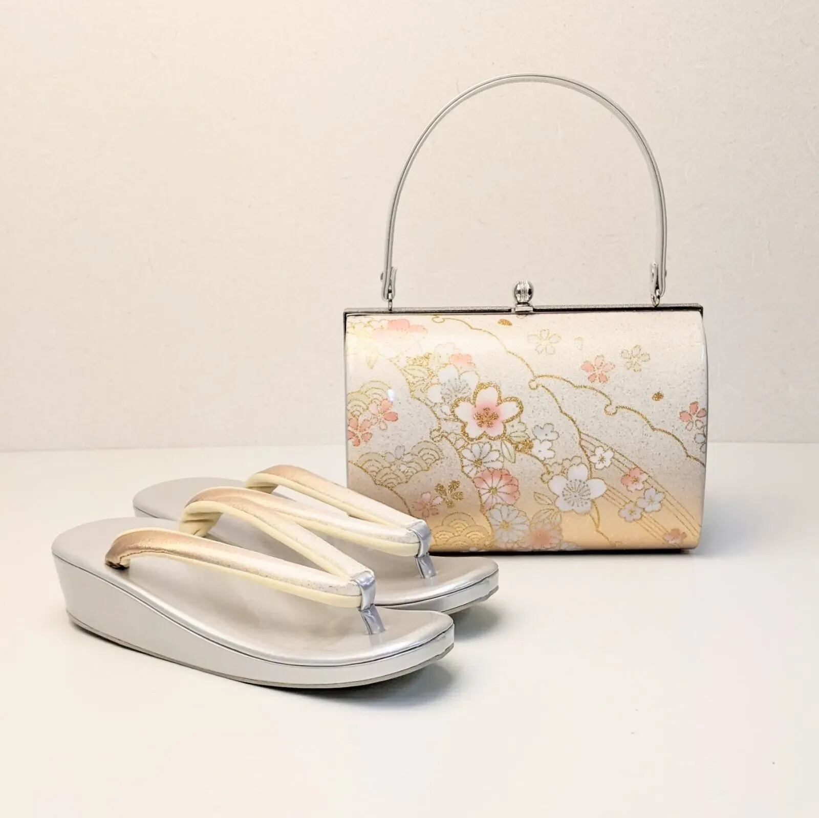 古典柄ですが可愛い雰囲気の草履とバッグ。