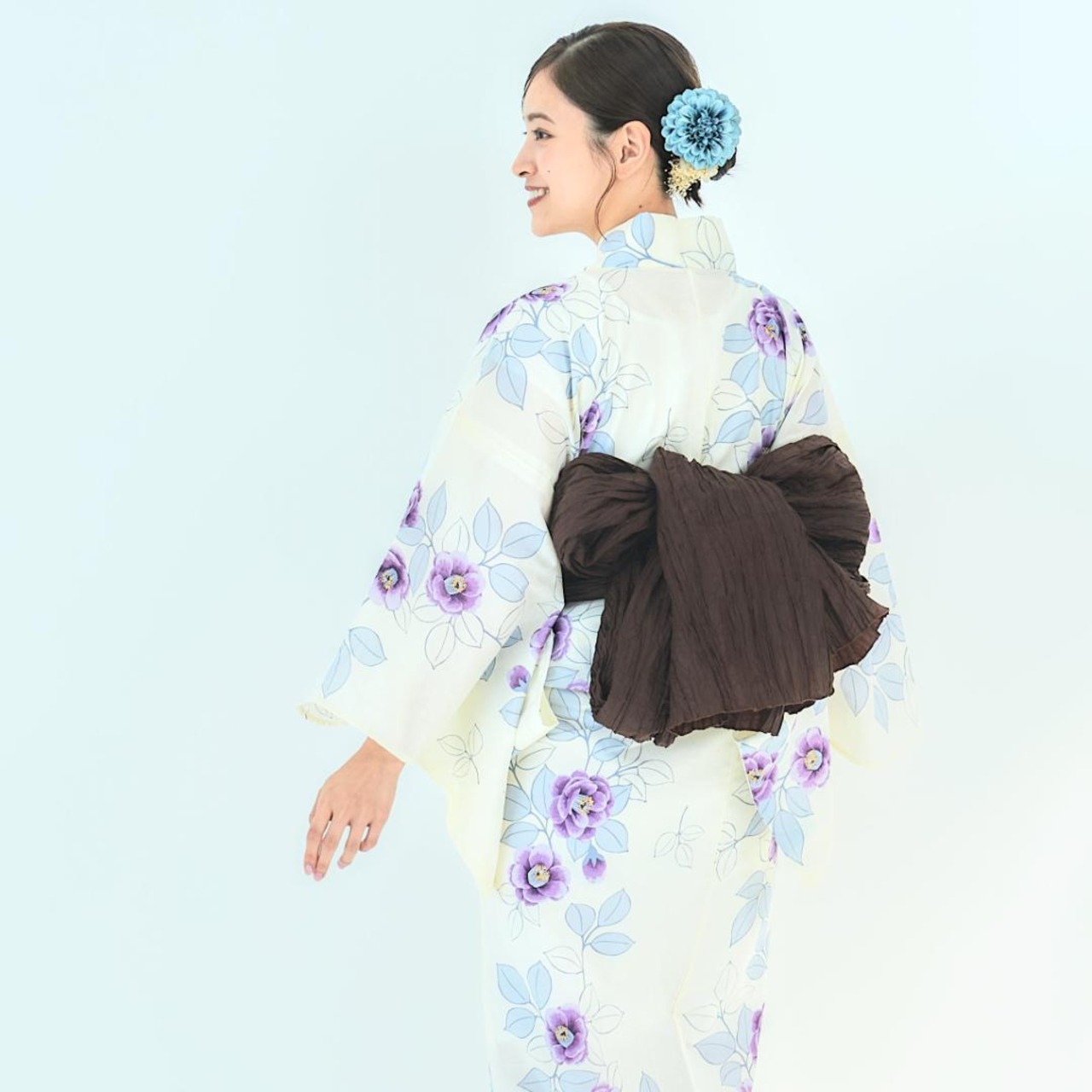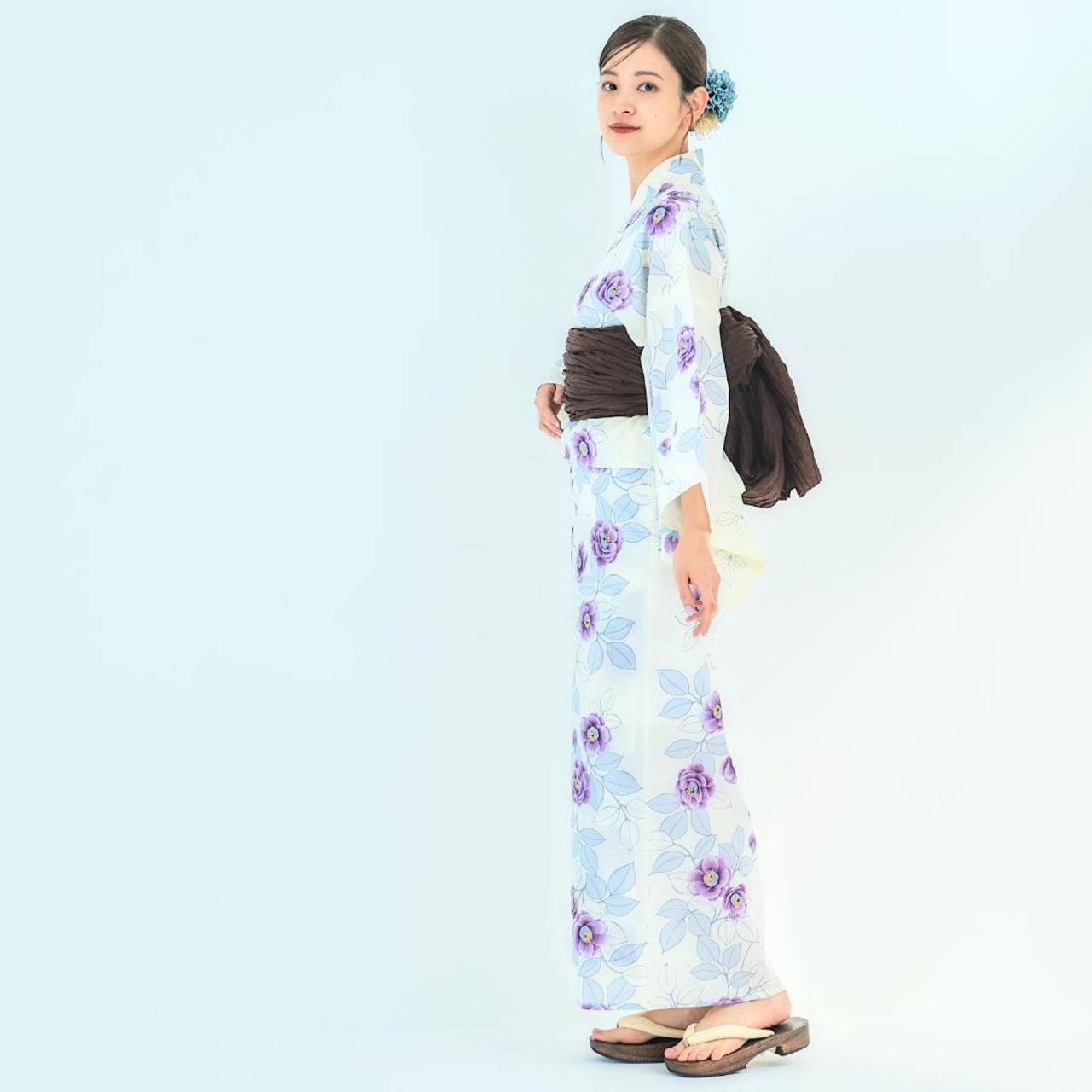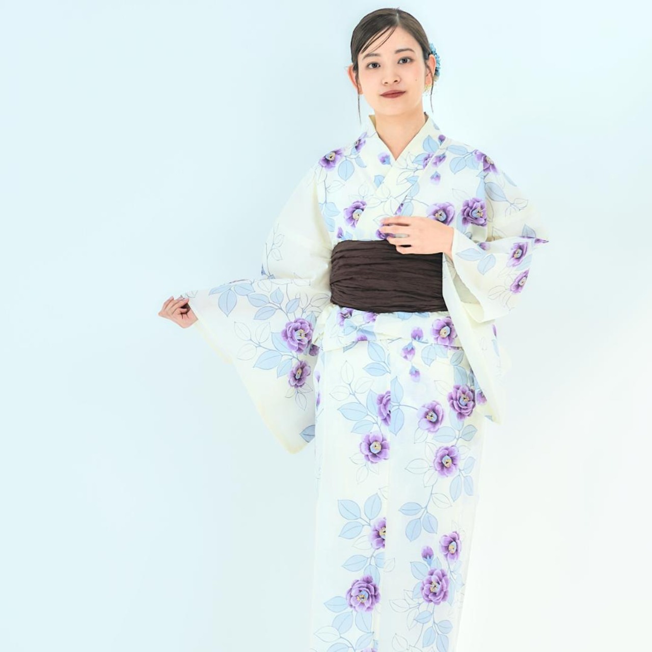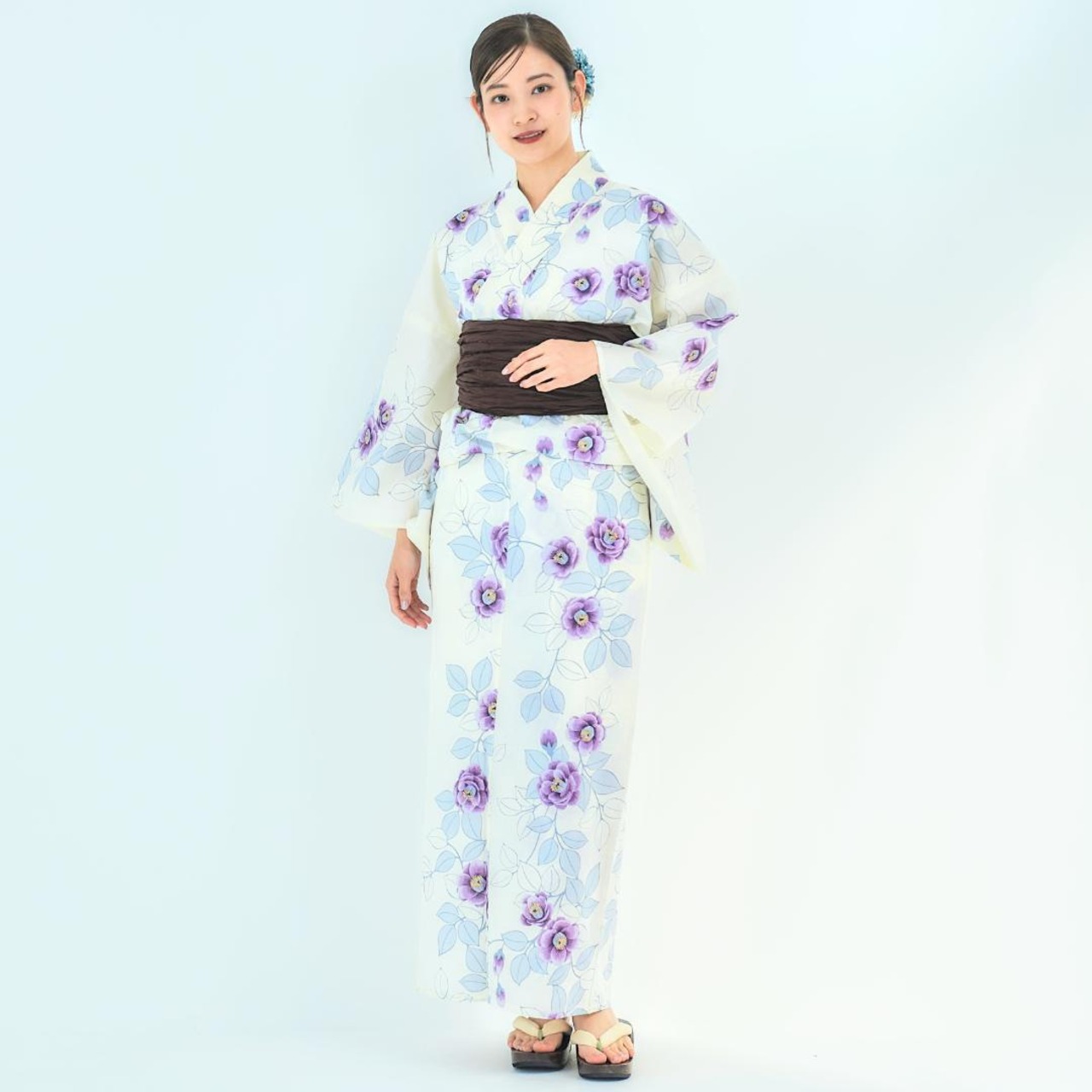 【2点セット】浴衣 兵児帯付き レディース 白 紫 椿 wy23