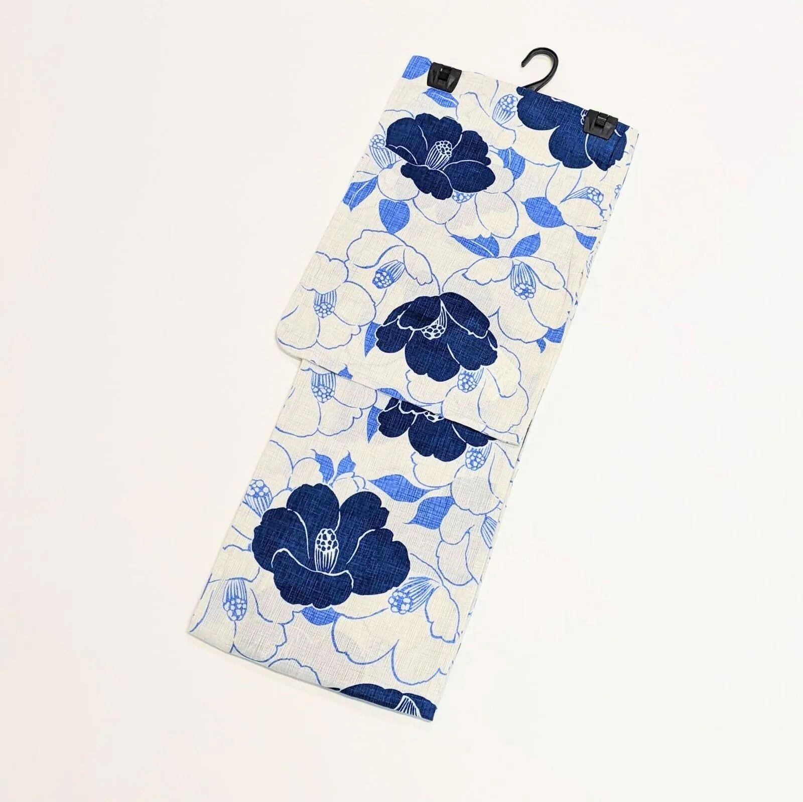 【綿麻】浴衣 単品 白 青 椿 フリーサイズ レディース wy26
