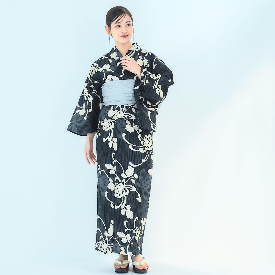 【綿麻】浴衣 単品 黒 グレー 菊 フリーサイズ レディース wy32