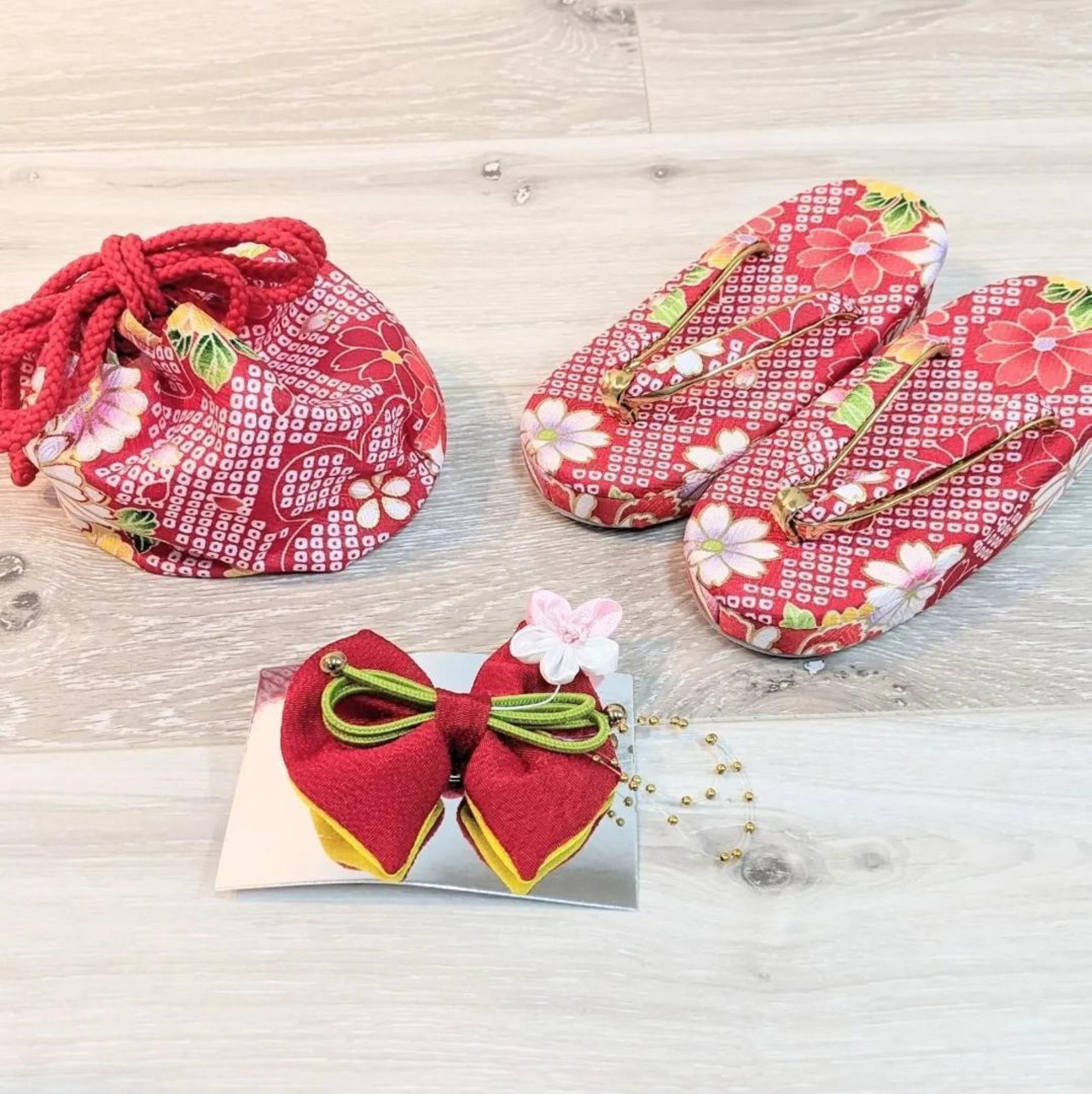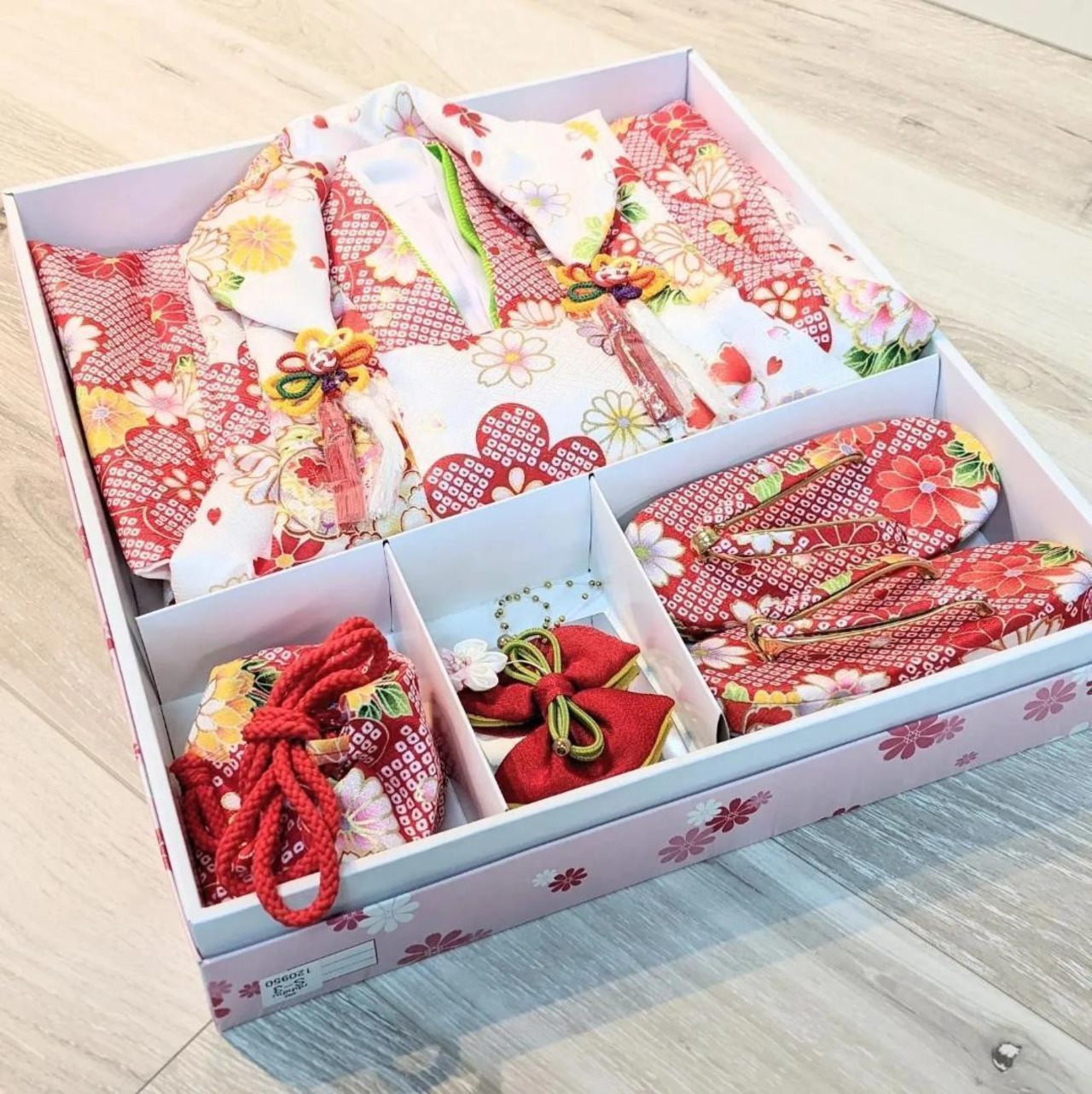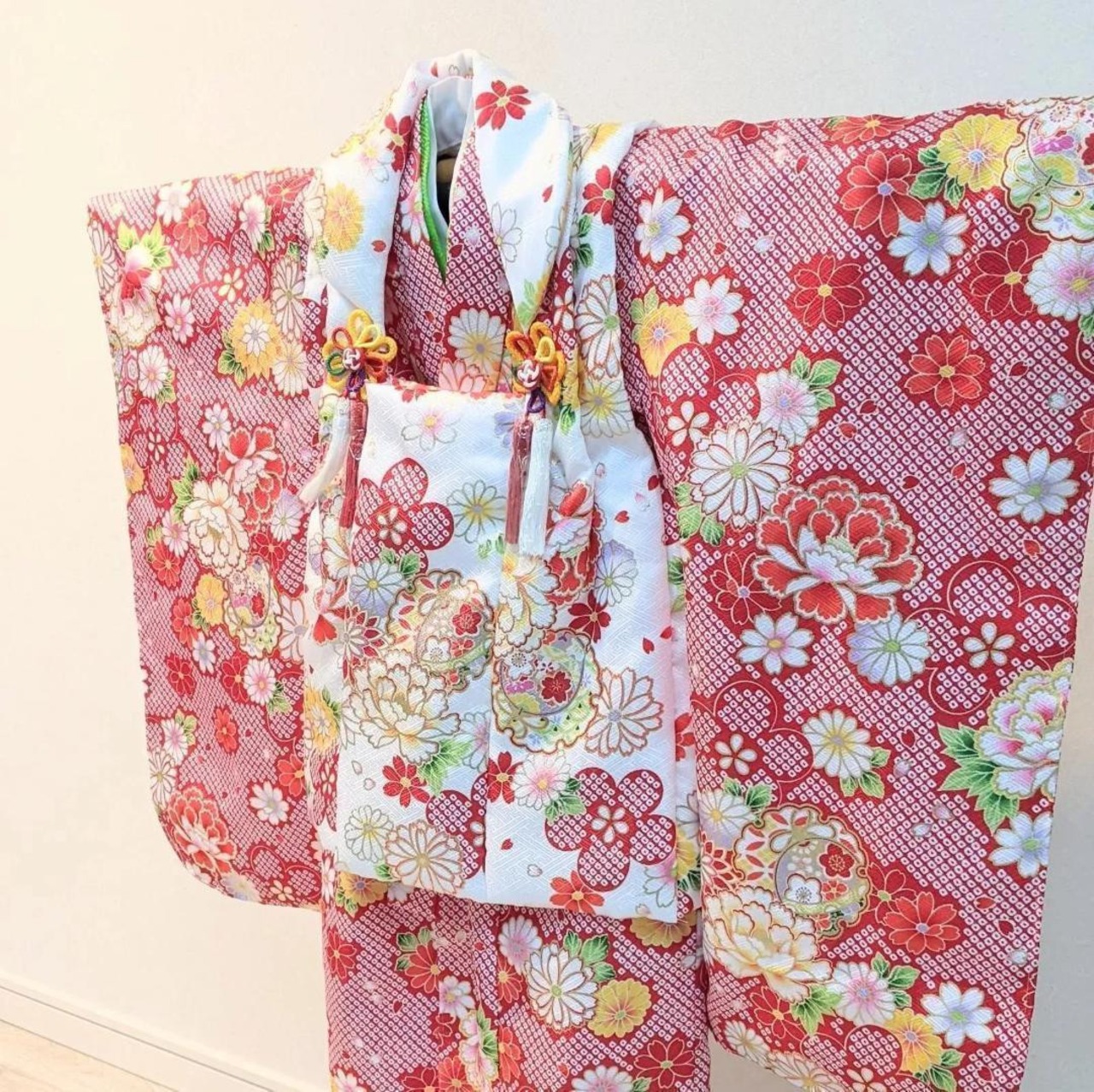 着物、被布コート、長襦袢、重ね衿(縫付済)、草履、巾着、髪飾り