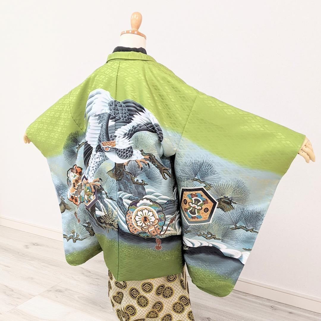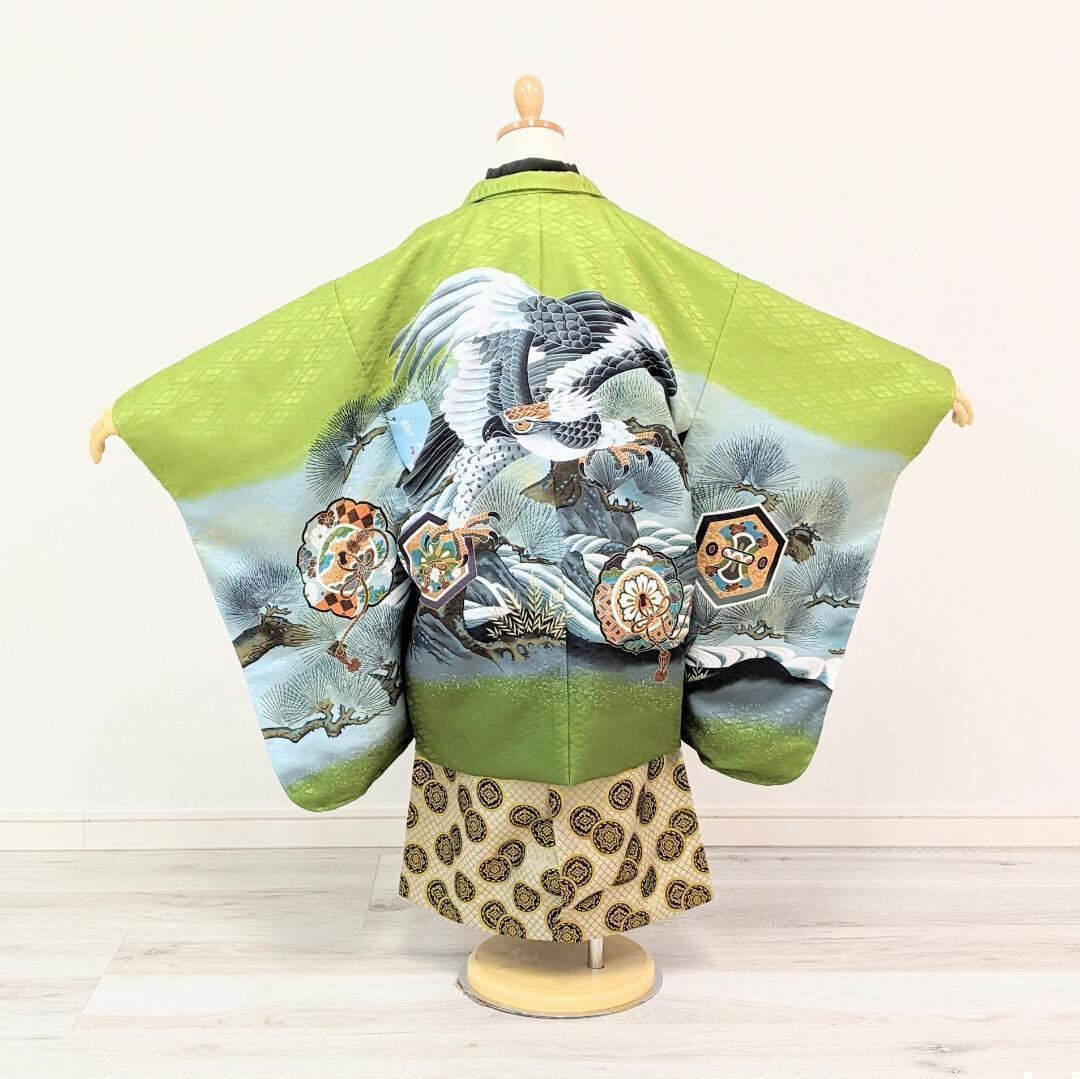 珍しい緑地に鷹の、着物・羽織・袴のセットです。