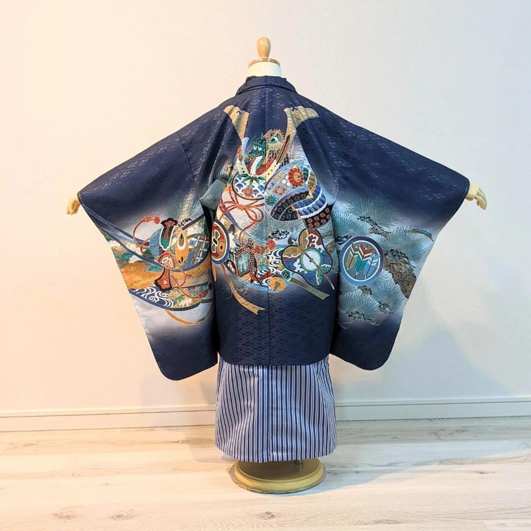 カッコいい紺地に兜の、着物・羽織・袴のセットです。
