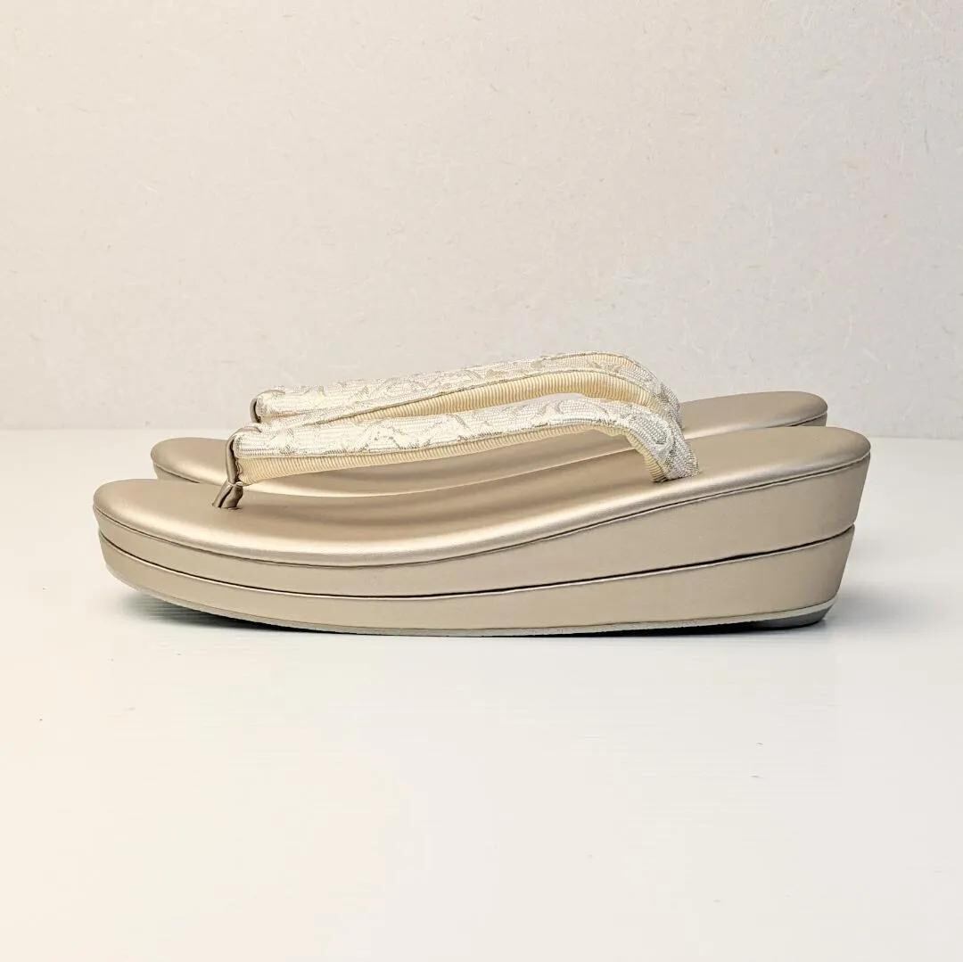 シャンパンゴールド系の上品な草履には、固すぎず柔らかすぎない程よいクッション性があり、長時間履いても疲れにくいです。