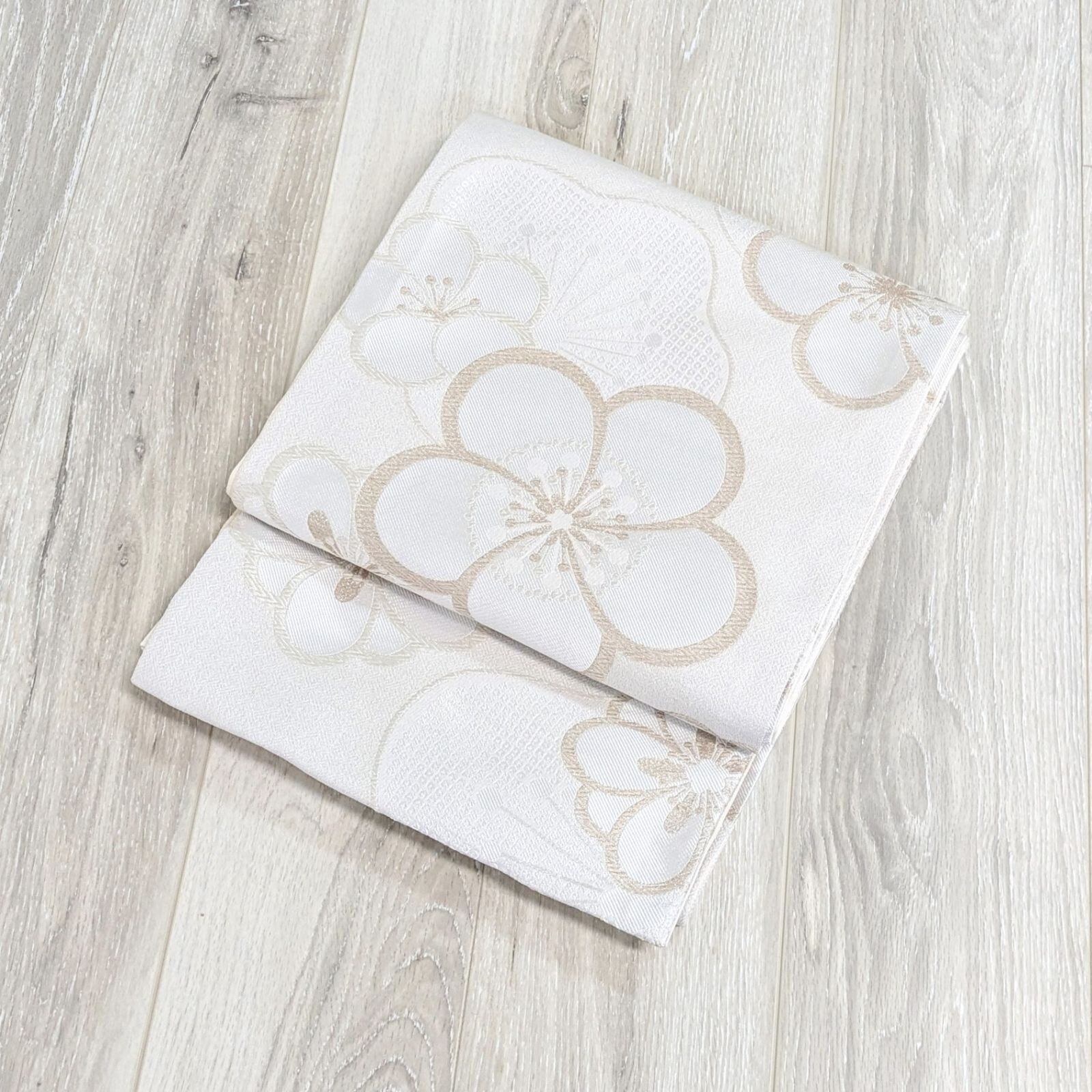 【新品・仕立て上がり】袋帯 白 ホワイト 全通 ポリエステル 梅 kb12